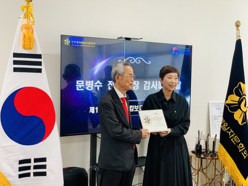 ‘제22기 해외 간부위원 워크숍’에 참석해 임명장을 수여한 후 민주평통 방용승 사무처장과 사진 촬영을 하고 있다.