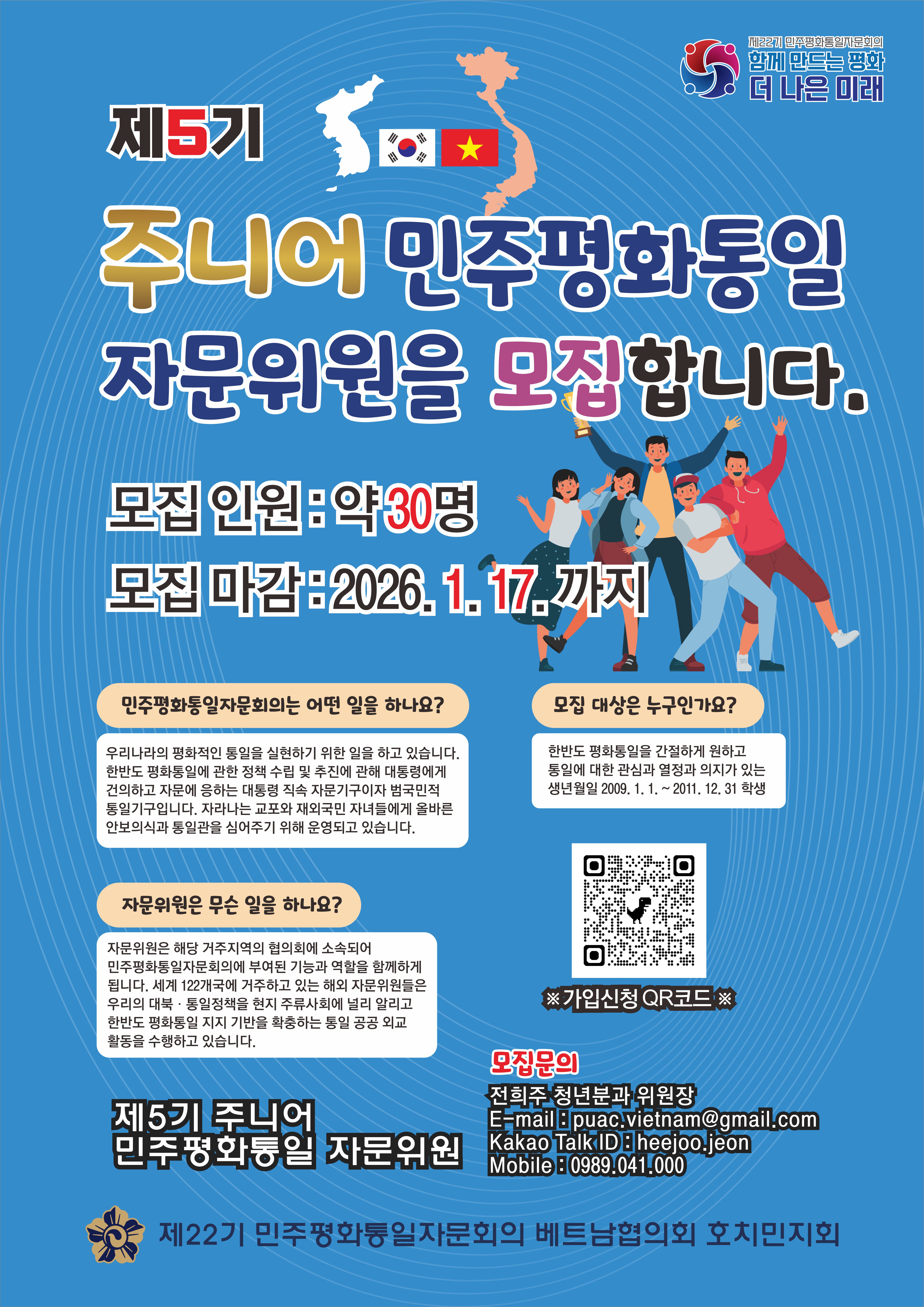제5기 주니어 민주평통 자문위원은 민즈평통 배트남협의회 호치민지회 자문위원들과 함깨 힌반도 평화담론형성을 위한 해외공공외교 활동을 진행할 예정으로 호치민시에 거주중인 중3-고2 한인 학생들을 대상으로 2026년 3월부터 2027년 10월 31일까지이며 30명의 학생들을 모집중이다.