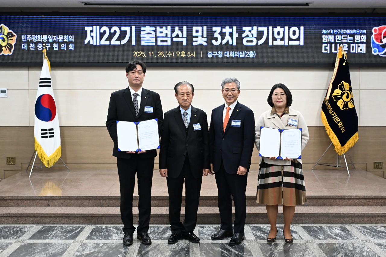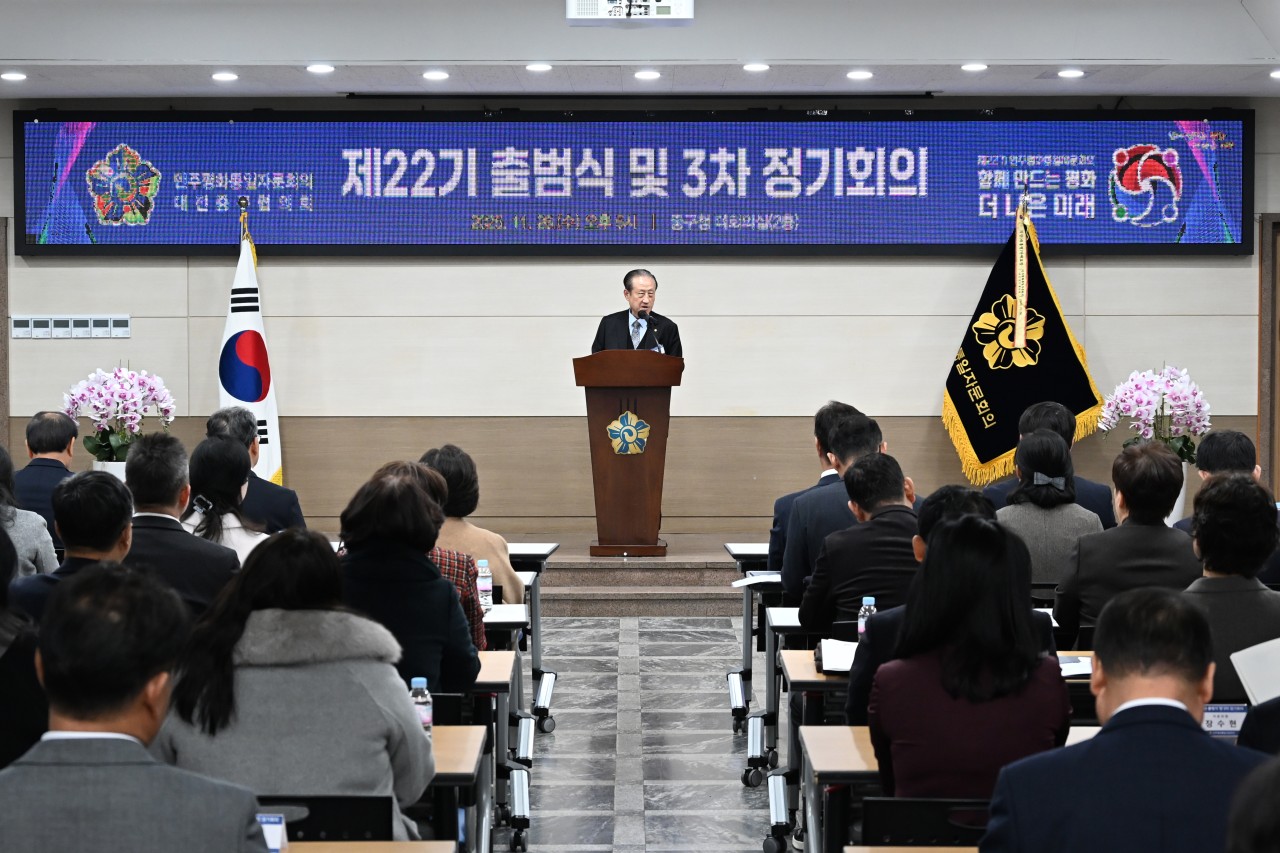 민주평화통일자문회의 대전중구협의회(협의회장 송영진)은 11월 26일(수) 17시, 중구청 대회의실(2층)에서 김병순 대전지역 부의장, 대행기관장인 김제선 중구청장, 자문위원, 내빈 등 70여명이 참석한 가운데 『제22기 대전중구협의회 출범식 및 3차 정기회의』를 개최하였다.