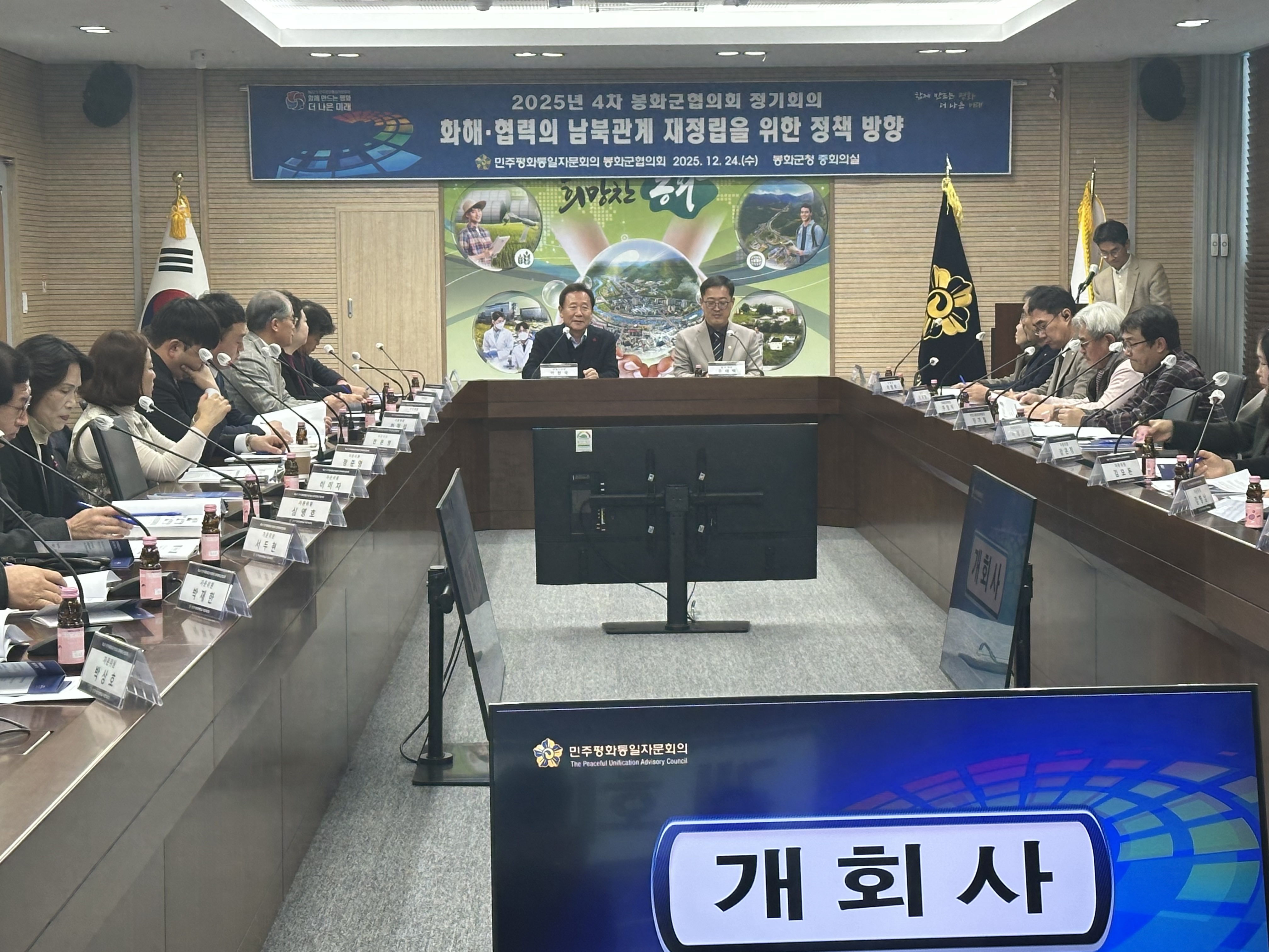 민주평화통일자문회의 봉화군협의회(협의회장 유태백)는 12월 24일(수) 11시 봉화군청 중회의실에서 박현국 군수, 자문위원 등 40여명이 참석한 가운데‘화해·협력의 남북관계 재정립을 위한 정책방향’을 주제로‘2025년 4차 정기회의’를 개최했다.