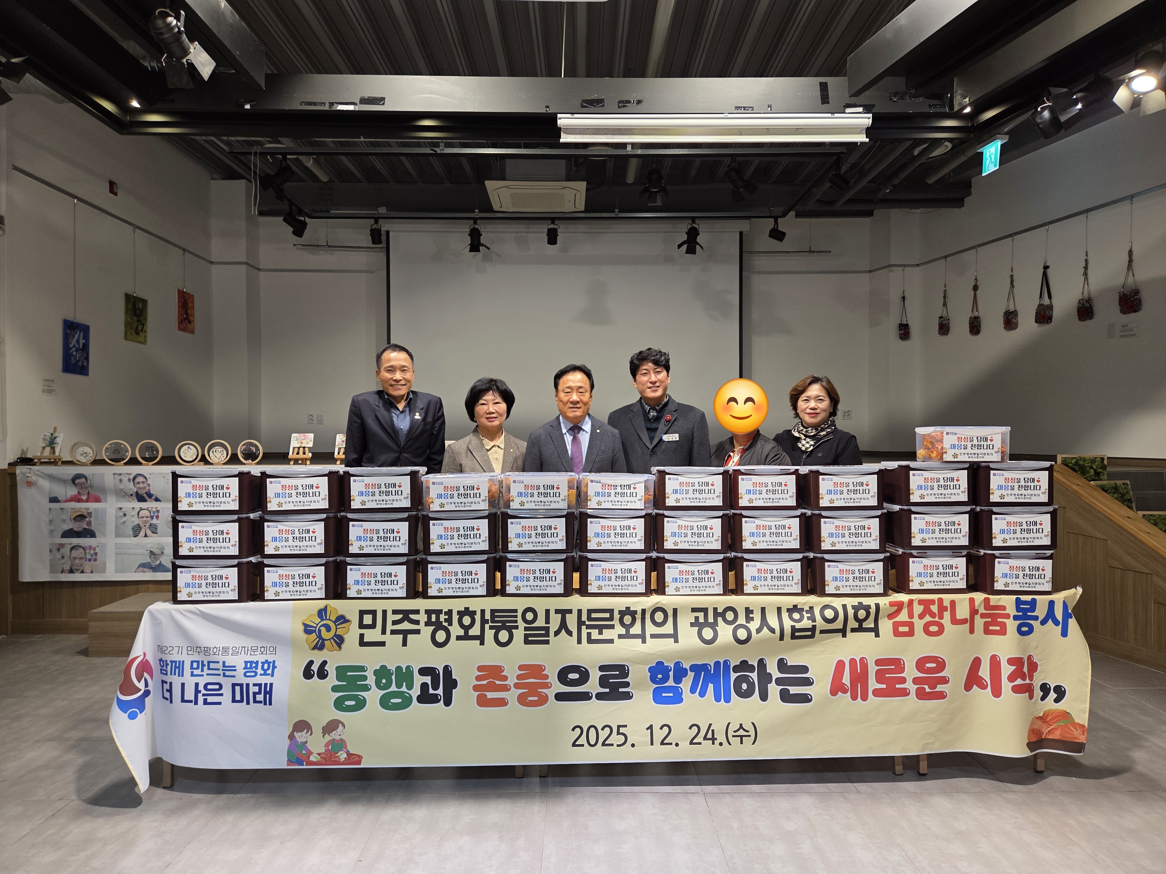 민주평화통일자문회의 광양시협의회(회장 박노신)는 2025. 12. 24.(수) 오후 15:00시 광양읍 MG새마을 금고 식당에서 북한이탈주민과 보훈단체회원 대상으로 50여명이 참석한 가운데 광양시협의회 김장나눔봉사 “동행과 존중으로 함께하는 새로운 시작” 행사를 개최하였다.