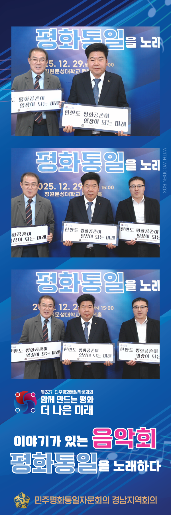 민주평화통일자문회의 경남지역회의(부의장 이재식)는 12월 29일(월) 오후 3시, 창원문성대학교 컨벤션홀에서 「이야기가 있는 평화통일음악회」를 개최했다.
