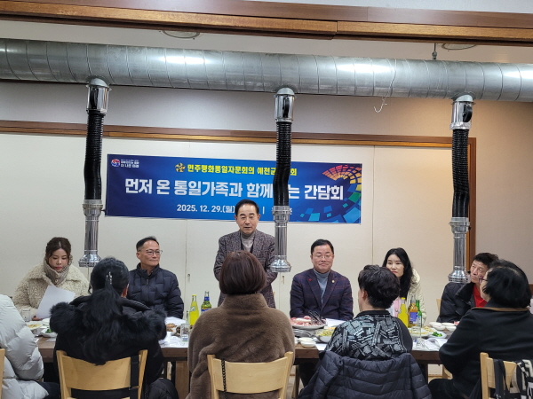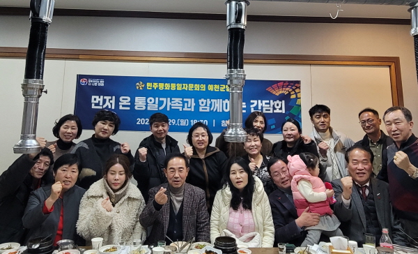 민주평화통일자문회의예천군협의회(협의회장 조경섭)는 12월 29일(월) 참우촌식당에서 조경섭협의회장님을 비롯하여 임원, 북한이탈주민, 관계자 등 21명이 참석한 가운데 먼저 온 통일가족과 함께하는 간담회를 개최했다.