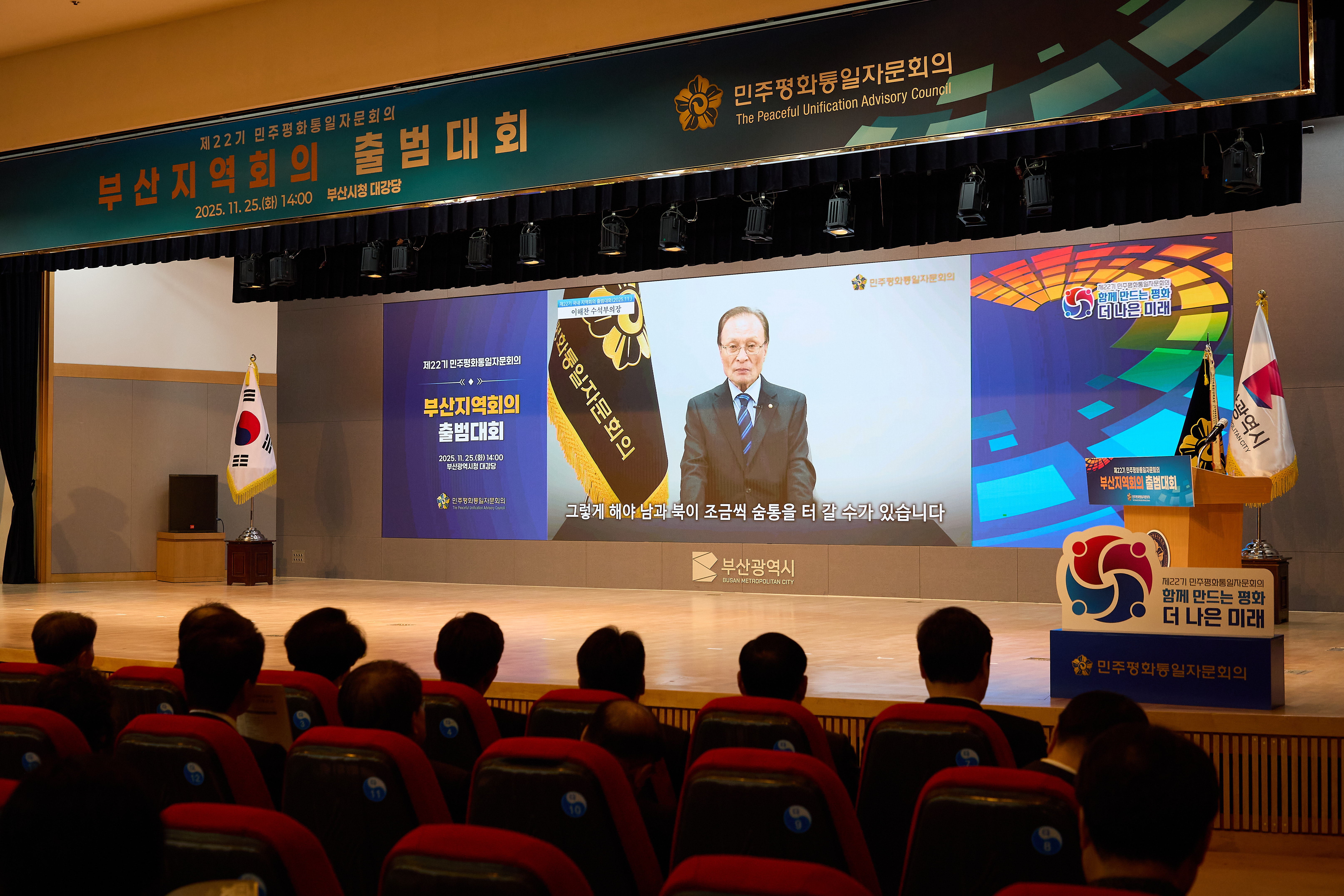 민주평화통일자문회의 부산지역회의(부의장 박사익)는 11월 25일(화) 부산시청 대강당에서『제22기 부산지역회의 출범대회』를 개최했다. 이날 출범대회에는 박사익 부산부의장, 박학민 사무차장, 성희엽 부산시미래혁신부시장, 16개 부산지역 협의회장, 자문위원 등 600여 명이 참석한 가운데 ‘제22기 부산지역회의 출범대회’를 성황리에 개최했다.
