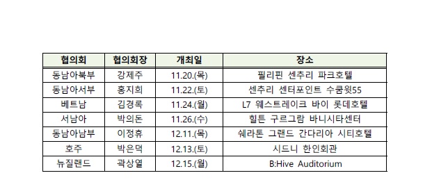 민주평화통일자문회의(수석부의장 이해찬, 사무처장 방용승, 이하 민주평통)는 지난 11월 19일부터 12월 15일까지 아시아·태평양지역 7개 협의회(서남아, 동남아남부, 동남아북부, 동남아서부, 베트남, 호주, 뉴질랜드) 출범회의를 개최했다.