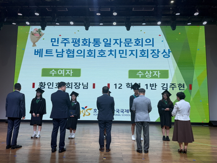 민주평통 베트남협의회 호치민지회 황인호 회장은 호치민시한국국제학교 우수 졸업자에게 수상하는 민주평통 베트남협의회 호치민지회장상과 함께 축하선물을