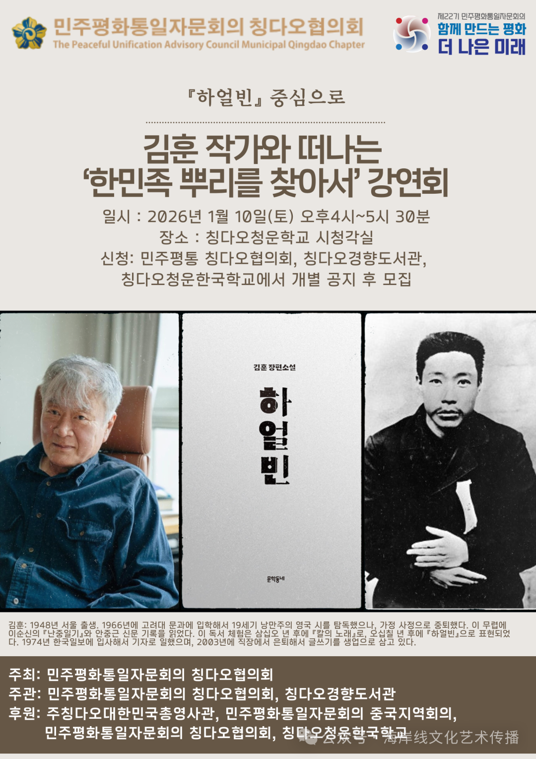 민주평화통일자문회의(이하 민주평통) 칭다오협의회는 소설 '하얼빈'의 저자 김훈 작가를 초청해 지난 1월 10일 칭다오청운한국학교에서 '한민족 뿌리를 찾아서'를 주제로 특별 강연회를 개최했다.