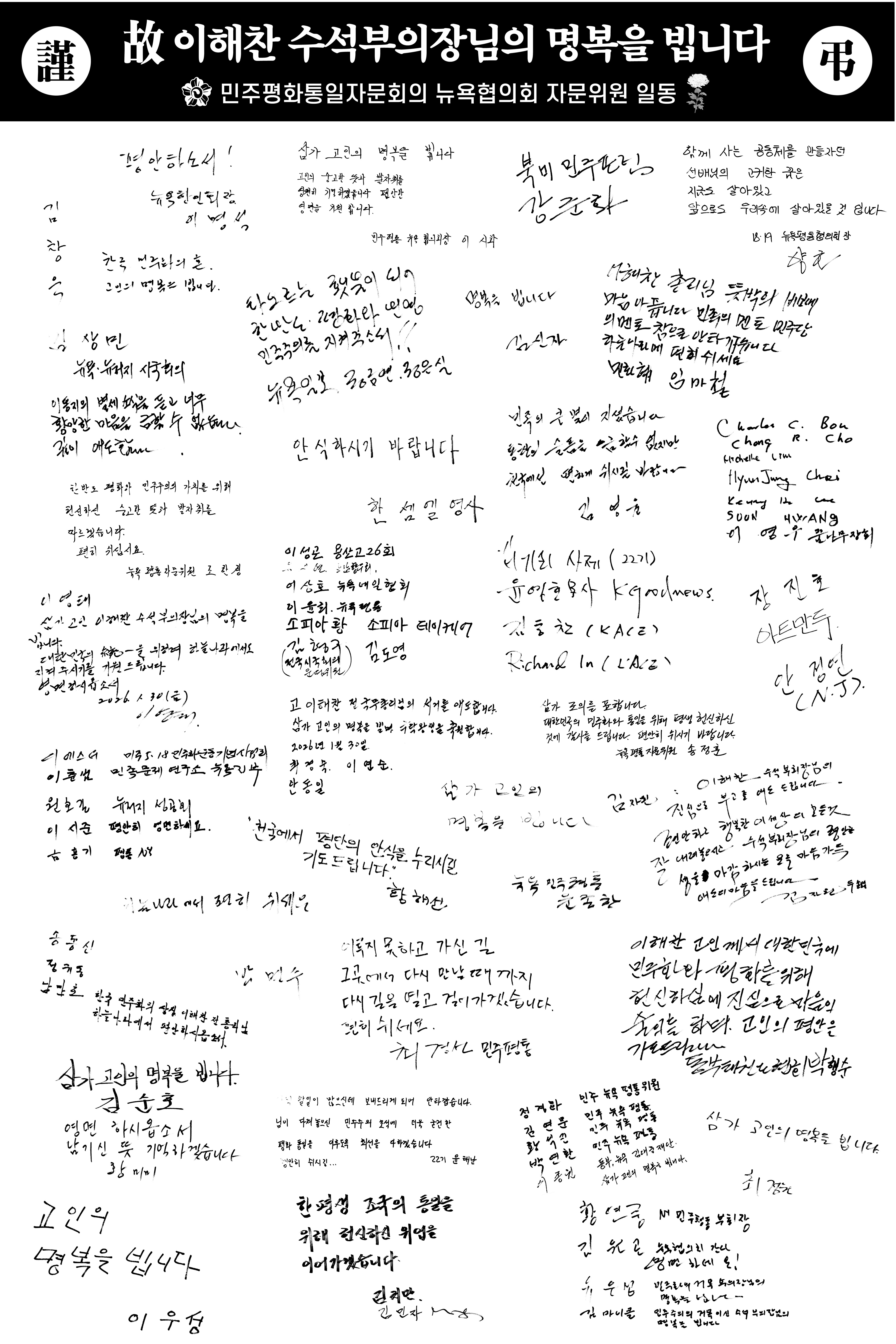 전·현직 민주평통 자문위원을 비롯해 시민사회단체 관계자, 민주화운동 인사, 종교계와 언론계 인사, 동포 사회 원로 및 차세대 인사들까지 폭넓게 참석해 고인을 추모했다.