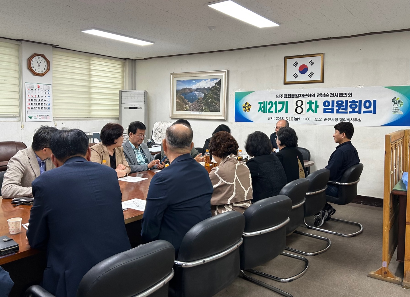 민주평화통일자문회의 전남순천시협의회(회장 임승규)는 2025.5.16.(금)11시, 순천시청 협의회사무실에서 임원 자문위원 12명이 참석한 가운데 제21기 8차(2025년 2분기) 임원회의를 개최하였다.
