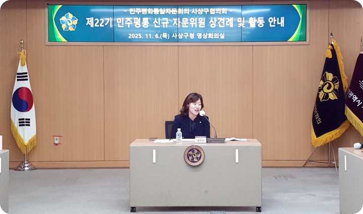 민주평화통일자문회의 부산사상구협의회(회장 송수진)는 11월 6일(목) 오후 6시 30분, 사상구청 3층 영상회의실에서 제22기 신규 자문위원 상견례 및 활동 안내 행사를 개최했다.