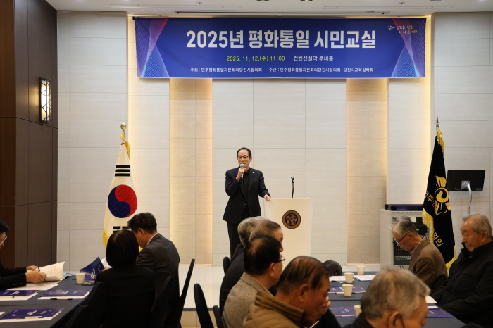 민주평화통일자문회의(이하 민주평통) 당진시협의회(회장 이강수)는 11월 12일(수) 오전 11시, 컨벤션설악 2층 루비홀에서 민주평통 자문위원, 당진시교육삼락회원, 관계자 등 80여명이 참석한 가운데 당진시교육삼락회와 공동 주관으로 '2025년 평화통일 시민교실'을 개최했다.