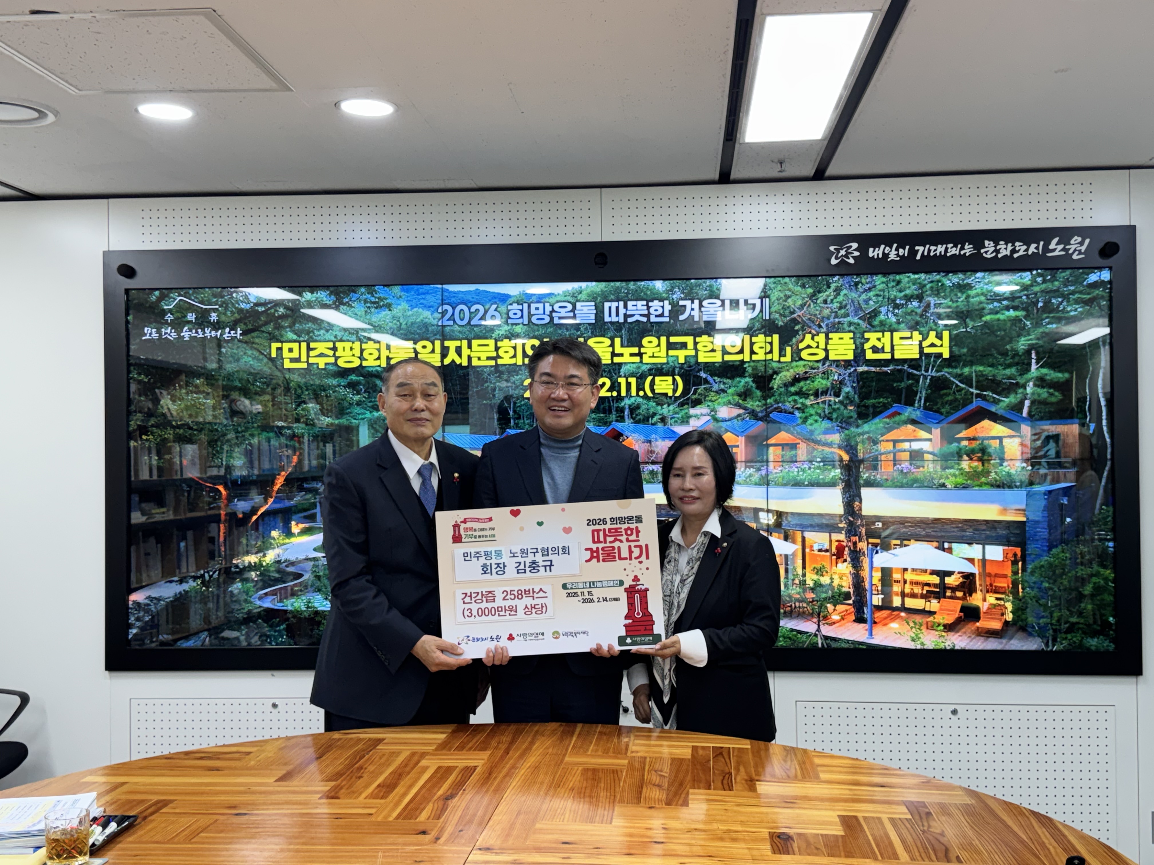 민주평화통일자문회의 서울노원구협의회(회장 김충규)는 11일(목) 오후 3시 30분, 노원구청장실에서 지역사회 취약계층을 위한 ‘2026 희망온돌 따뜻한 겨울나기’ 나눔 캠페인에 동참하며 건강즙 전달식을 가졌다.