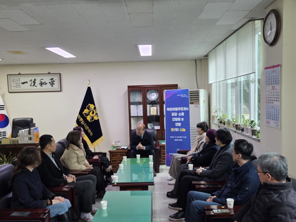 고필호 간사 사회로 진행된 간담회에서 ▲정착과정에서의 어려움 ▲자녀교육 ▲지역사회 적응을 위한 건의사항등 자유롭게 의견을 나누는 시간을 가졌으며, 상호 공감과 이해를 바탕으로 실질적 지원 방안에 대해 논의했다.