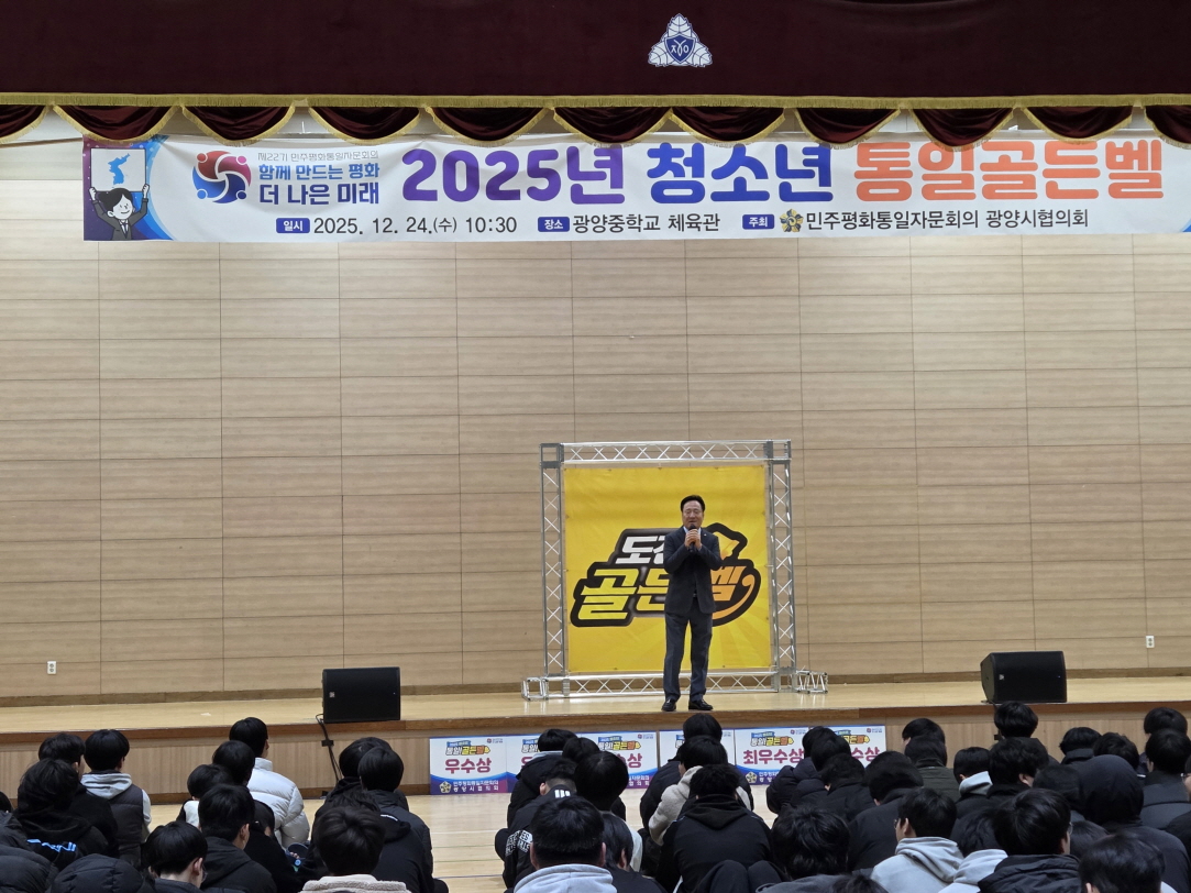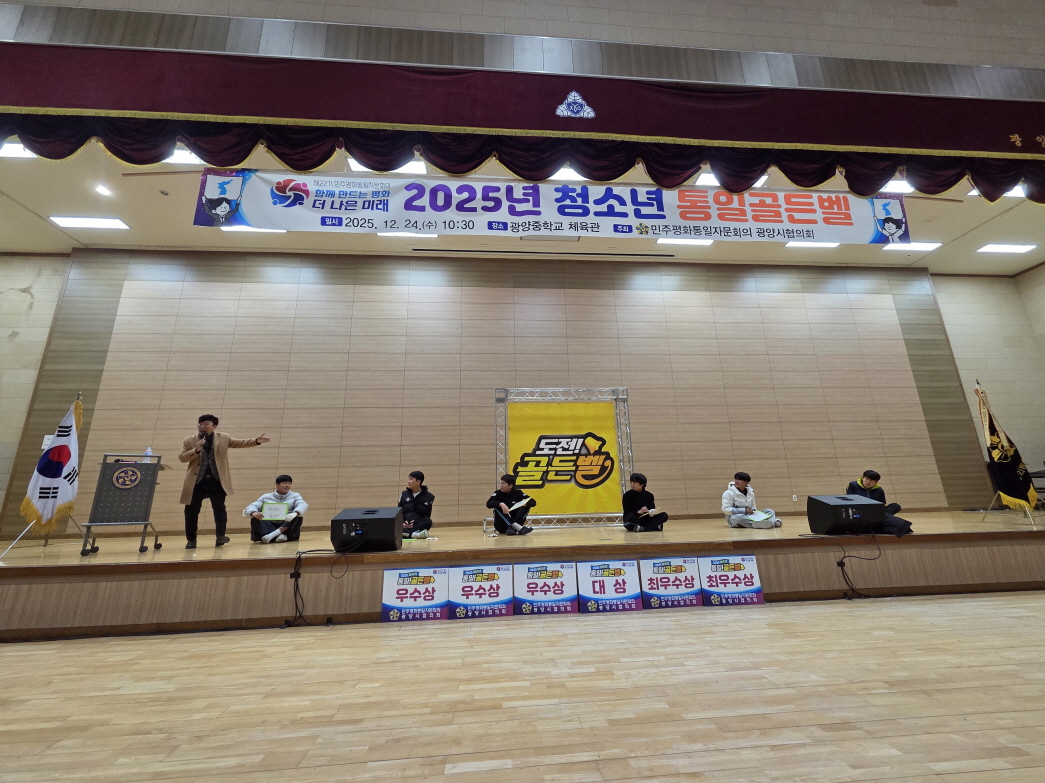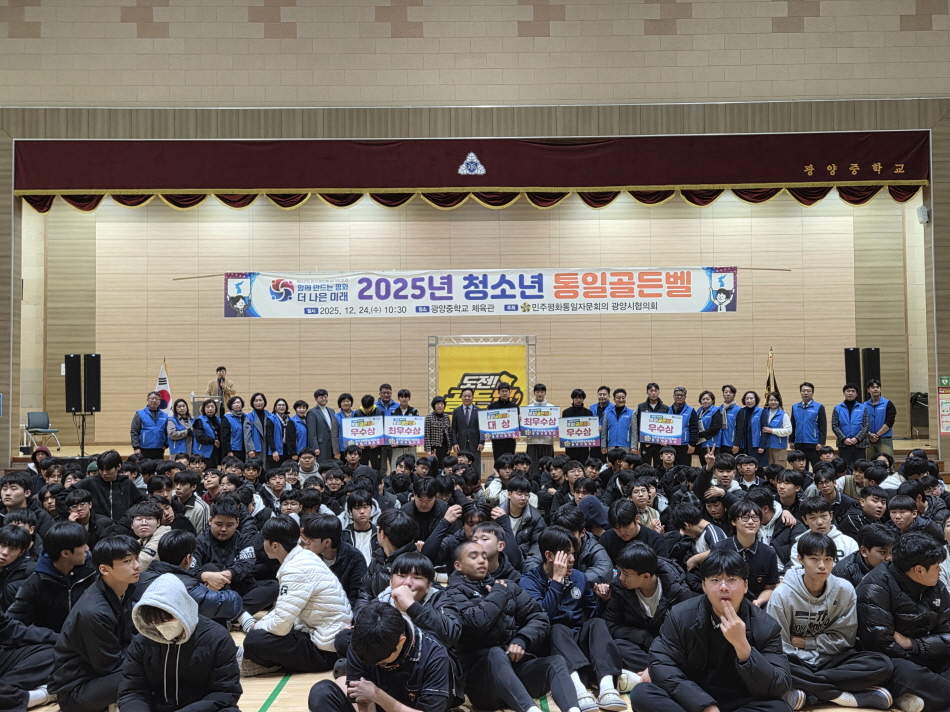 민주평화통일자문회의 광양시협의회(회장 박노신)는 2025. 12. 24.(수) 10:30분에 광양중학교 체육관에서 360여명에 학생이 참석한 가운데 “2025년 청소년 통일골든벨” 행사를 개최하였다.