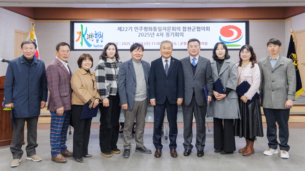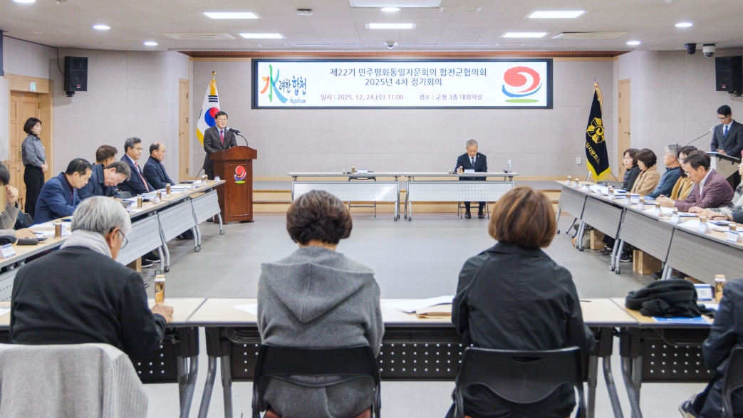 민주평화통일자문회의 합천군협의회(협의회장 정병균,)는 12월 24일(수) 오전 11시, 합천군청 대회의실에서 50여명이 참석한 가운데‘화해·협력의 남북관계 재정립을 위한 정책방향’을 주제로‘2025년 4차 정기회의’(이하‘정기회의’)를 개최했다.