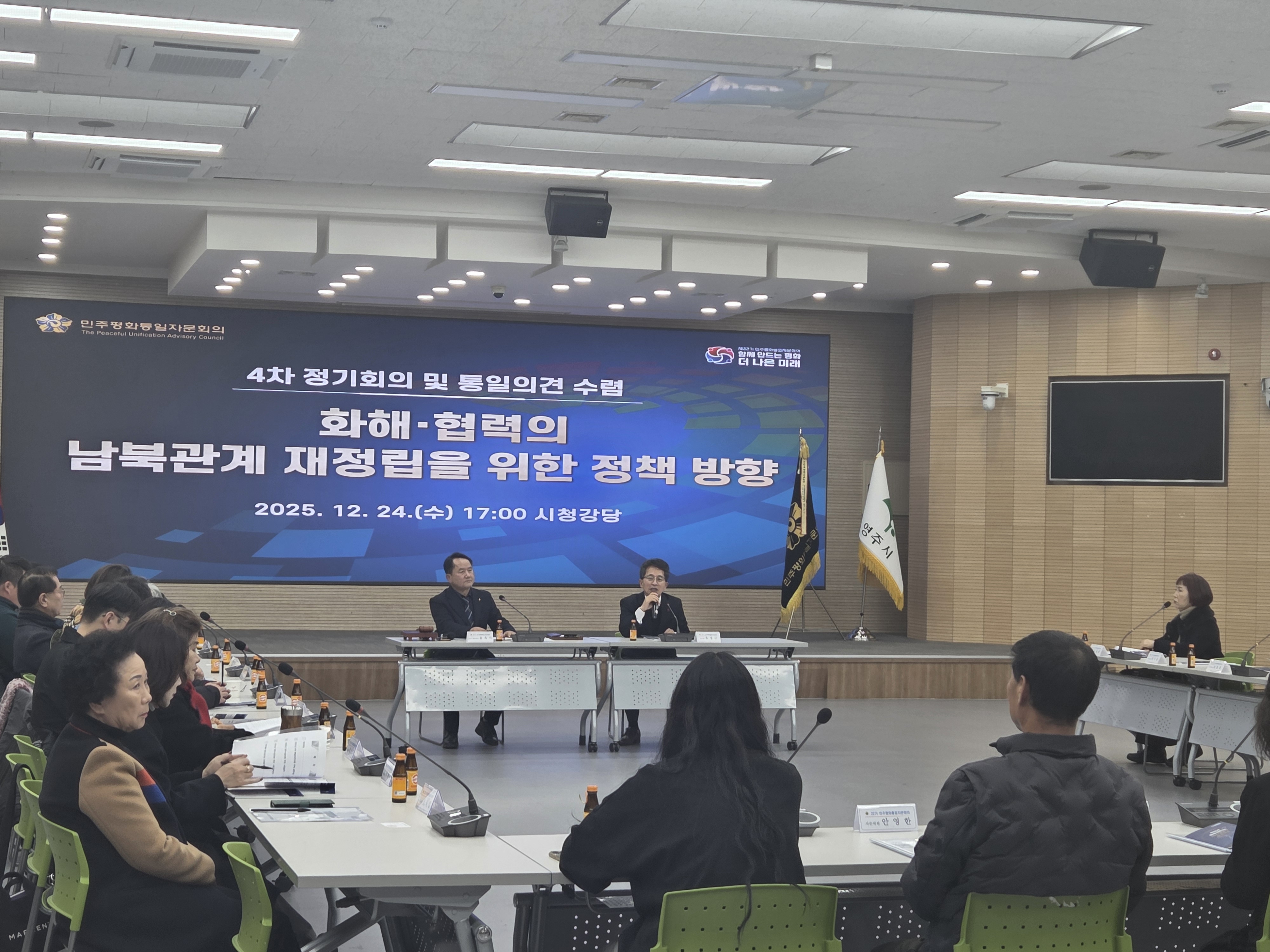 4차 정기회의는 ▲국민의례 ▲성원보고 및 개회선언 ▲인사말 ▲제22기 민주평통 자문위원 안내영상 시청 ▲주제설명 ‘화해·협력의 남북관계 재정립을 위한 정책방향’ ▲자유토론 및 설문지 작성 ▲2025년 사업실적 보고 및 2026년 사업계획 논의 ▲기념촬영 순으로 진행되었다.