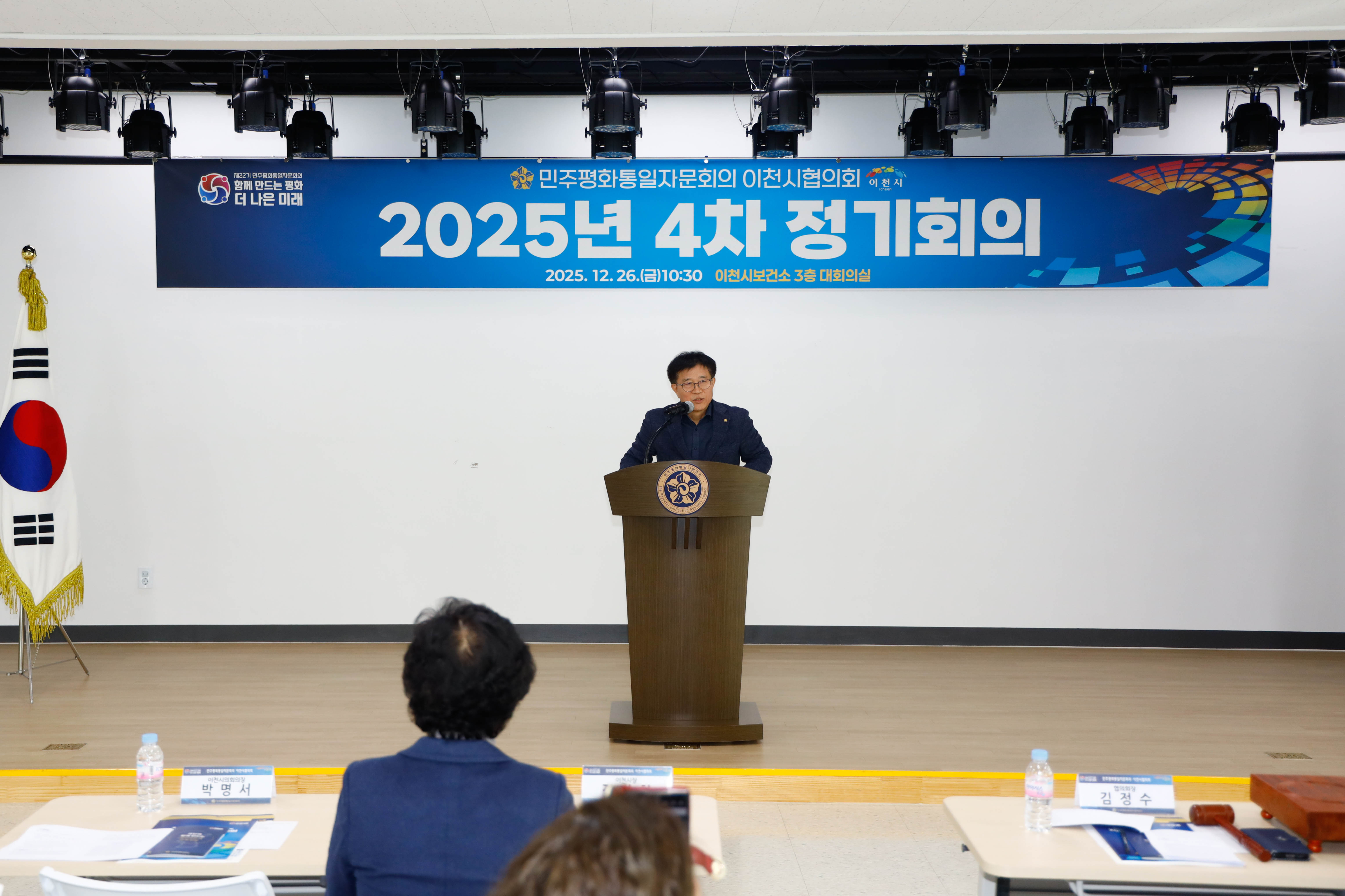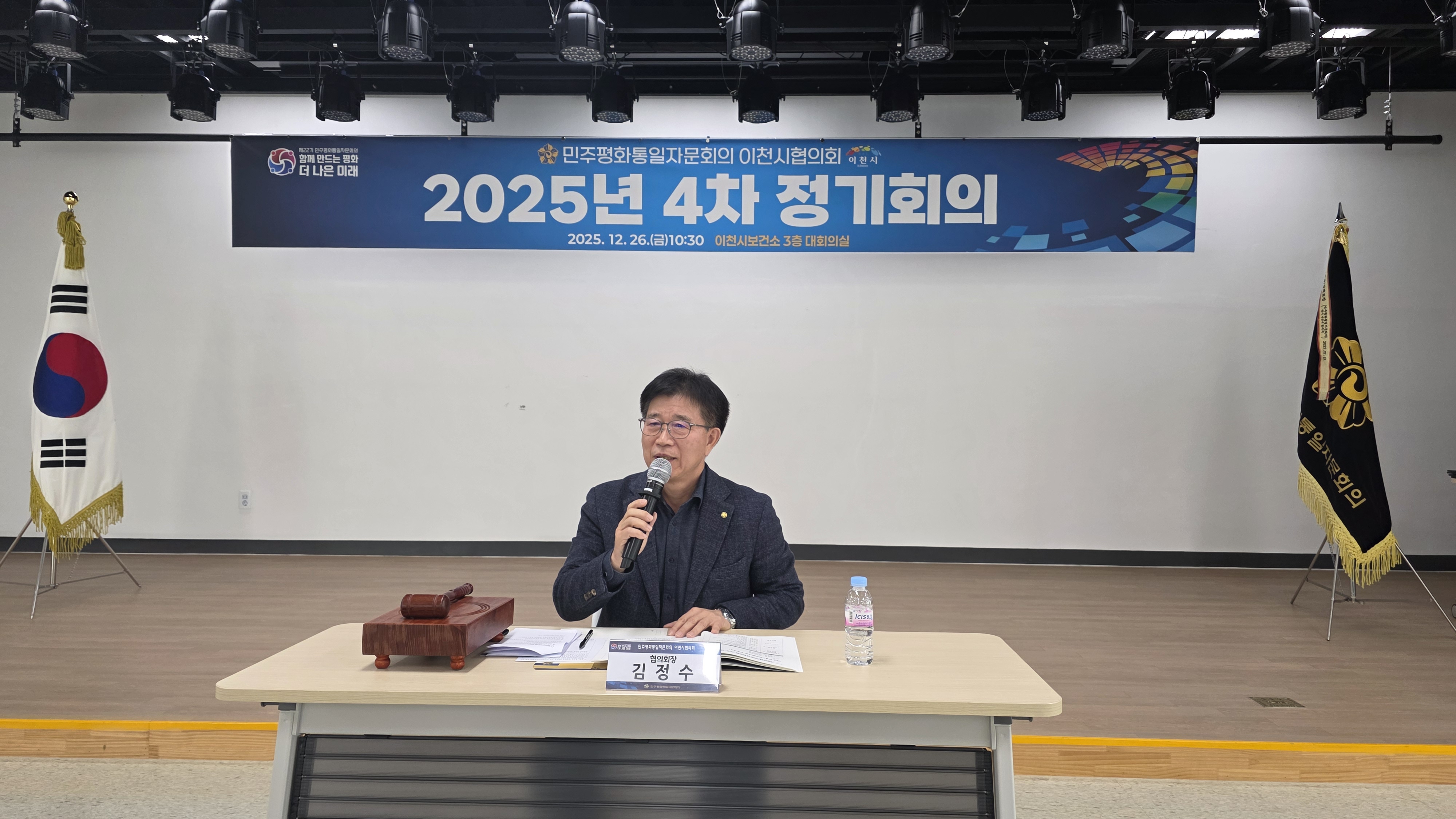 민주평화통일자문회의 이천시협의회(협의회장 김정수, 이하 ‘이천시협의회’)는 12월 26일(금) 오전 10시 30분, 이천시보건소 3층 대회의실에서 김경희 이천시장과 자문위원 등 50명이 참석한 가운데 ‘화해·협력의 남북관계 재정립을 위한 정책방향’을 주제로 2025년 4차 정기회의(이하 ‘정기회의’)를 개최했다.