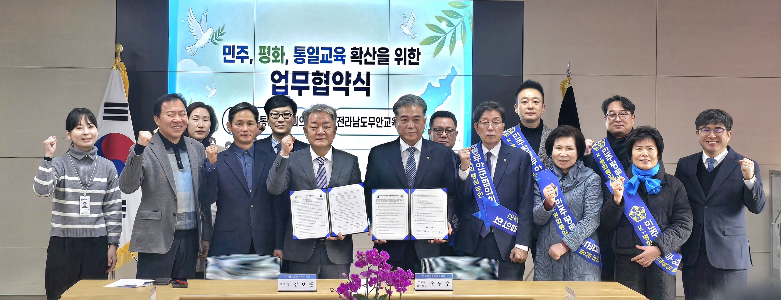 민주평화통일자문회의 무안군협의회(회장 송남수)와 전라남도무안교육지원청(교육장 김보훈)은 2026년 1월 14일(수) 오전 11시, 무안교육지원청 3층 회의실에서‘민주·평화·통일교육 확산을 위한 업무협약(MOU)’을 체결했다.