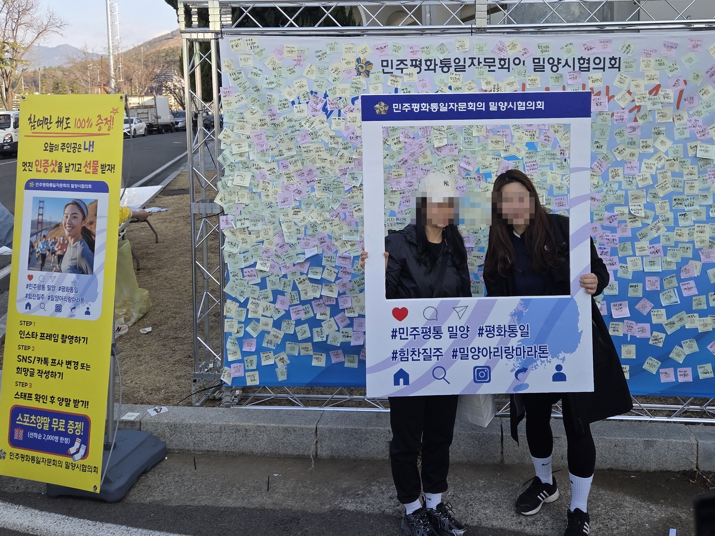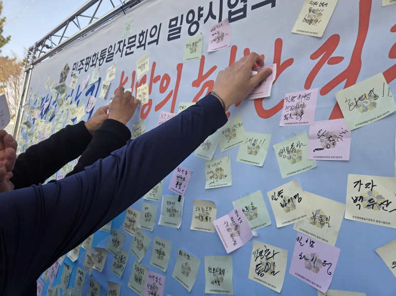 이날 밀양시협의회 부스에서는 ▲평화통일 희망 지도 완성하기 ▲인증샷 SNS 홍보 이벤트 등 시민들이 직접 참여하고 즐길 수 있는 체험 중심 프로그램을 운영해 폭발적인 호응을 얻었으며, 참가자들은 대형 한반도 지도에 저마다의 통일 염원을 담은 메시지를 정성껏 채워 넣으며, 평화를 향한 희망의 발걸음을 함께 내딧뎠다. 특히, 마라톤에 참여한 한 시민은 **“마라톤의 열정으로 백두산까지 달려보자!”**라는 파이팅 넘치는 메시지를 남겨 현장 방문객들의 눈길을 끌기도 했다.