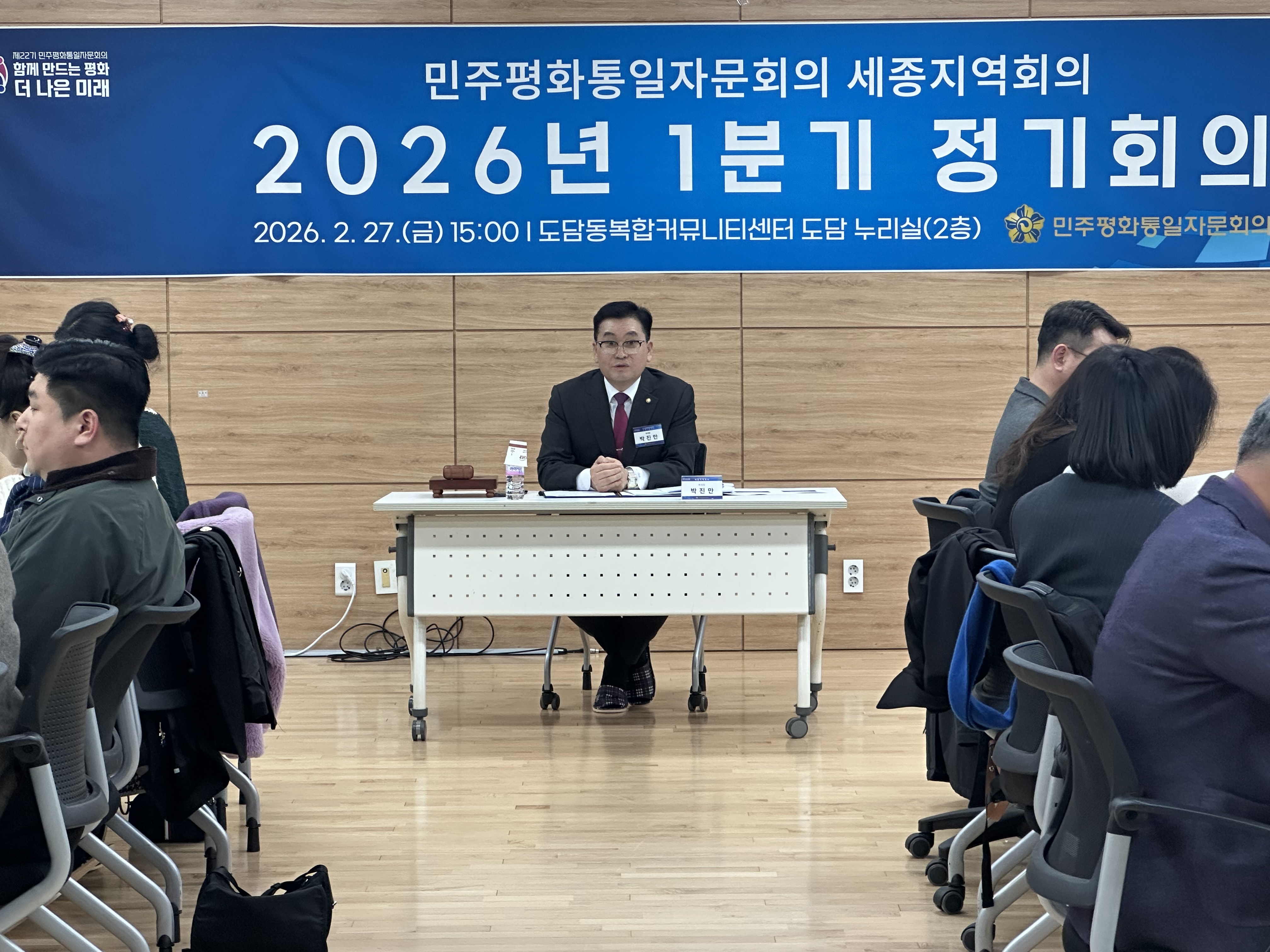 민주평화통일자문회의 세종지역회의(부의장 박진만, 이하 ‘세종지역회의’)는 2월 27일(금) 오후 3시 도담동복합커뮤니티센터 도담누리실(2층)에서 자문위원 등 60명이 참석한 가운데 「한반도 평화공존을 위한 대내외 정책 추진방향」을 주제로 ‘2026년 1분기 정기회의’를 개최했다.