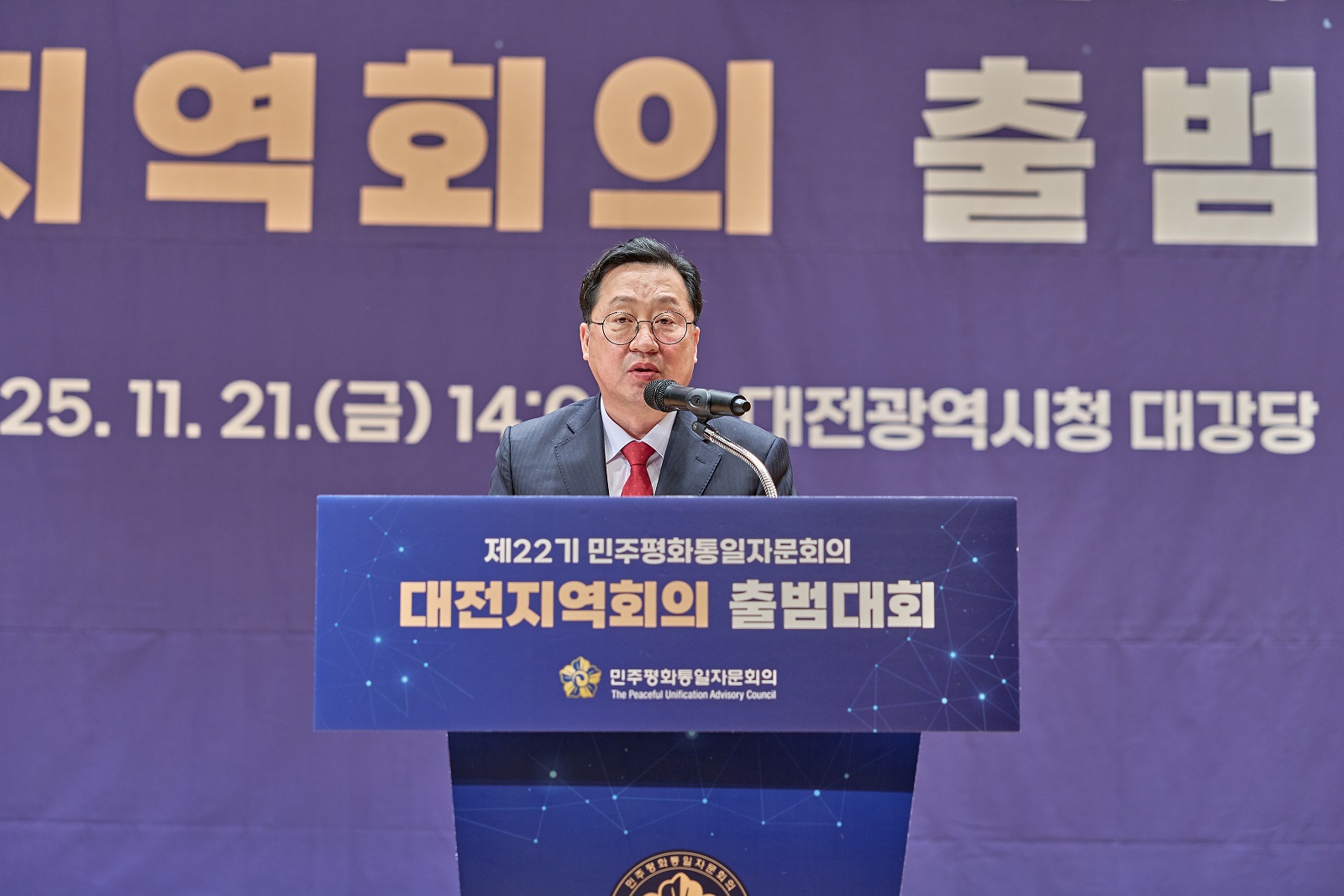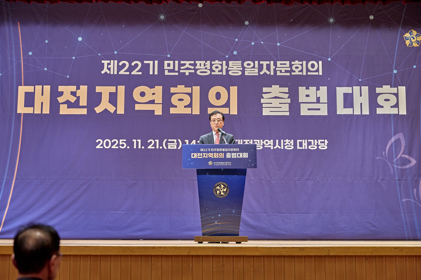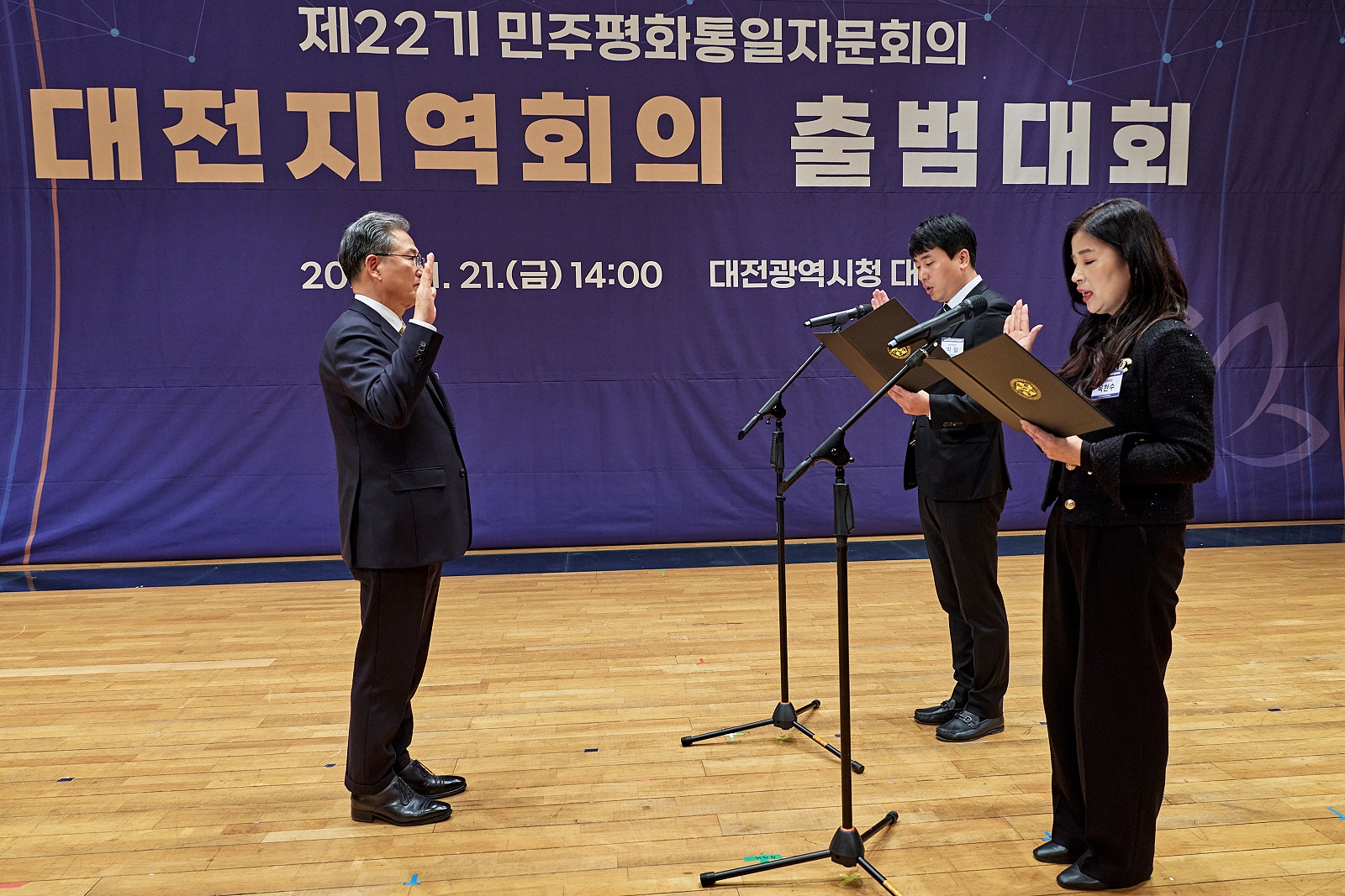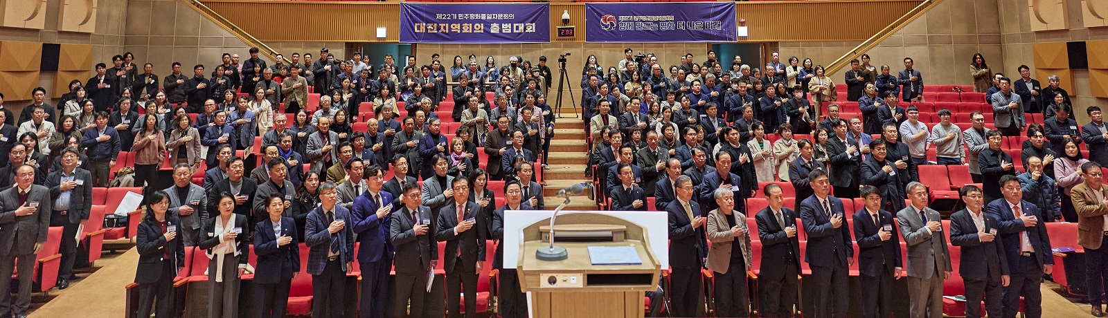 민주평화통일자문회의 대전지역회의(부의장 김병순)는 11월 21일(금) 대전광역시청 대강당에서 『제22기 대전지역회의 출범대회 』를 개최했다. 이날 출범대회에는 이해찬 수석부의장, 이장우 대전광역시장, 조원휘 대전광역시의회 의장과 자문위원 400여 명이 참석해 제22기 대전지역회의의 힘찬 출발을 알렸다.