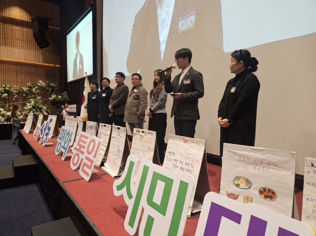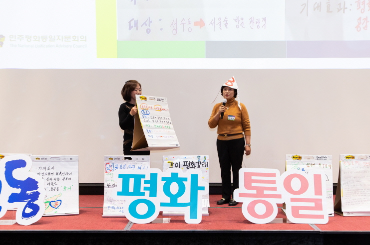다음 순서로 오천수 성동 평화통일 시민대화 준비위원(성동구의회 부의장)이 시민대화 추진경과를 보고하고, 김현우 준비위원((사)더나은 이사장)이 ‘성동구 핫플을 ‘평화통일 문화축제’의 핫플로’ 등 11개의 성동 통일공감대 추진과제를 제안했다.