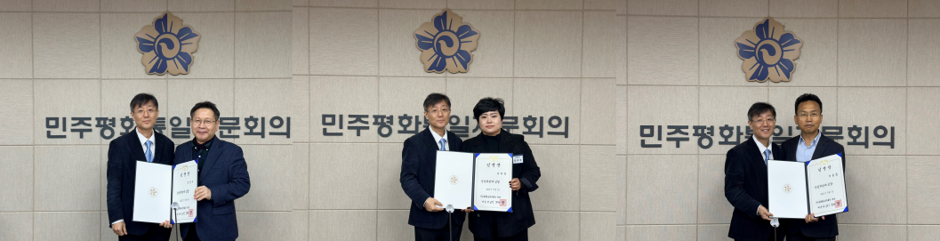 ▶ 상임위원 임명장을 수여하는 이정철 위원장(왼쪽으로부터 강민구, 이미정, 임을출 상임위원)