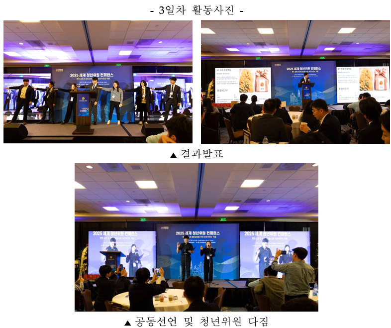 마지막 3일차에는 분임별 최종 결과발표와 청년위원 공동선언을 통해 실천 의지를 공유했으며, 총평과 마무리말씀을 끝으로 3일 간의 컨퍼런스가 마무리 되었다.