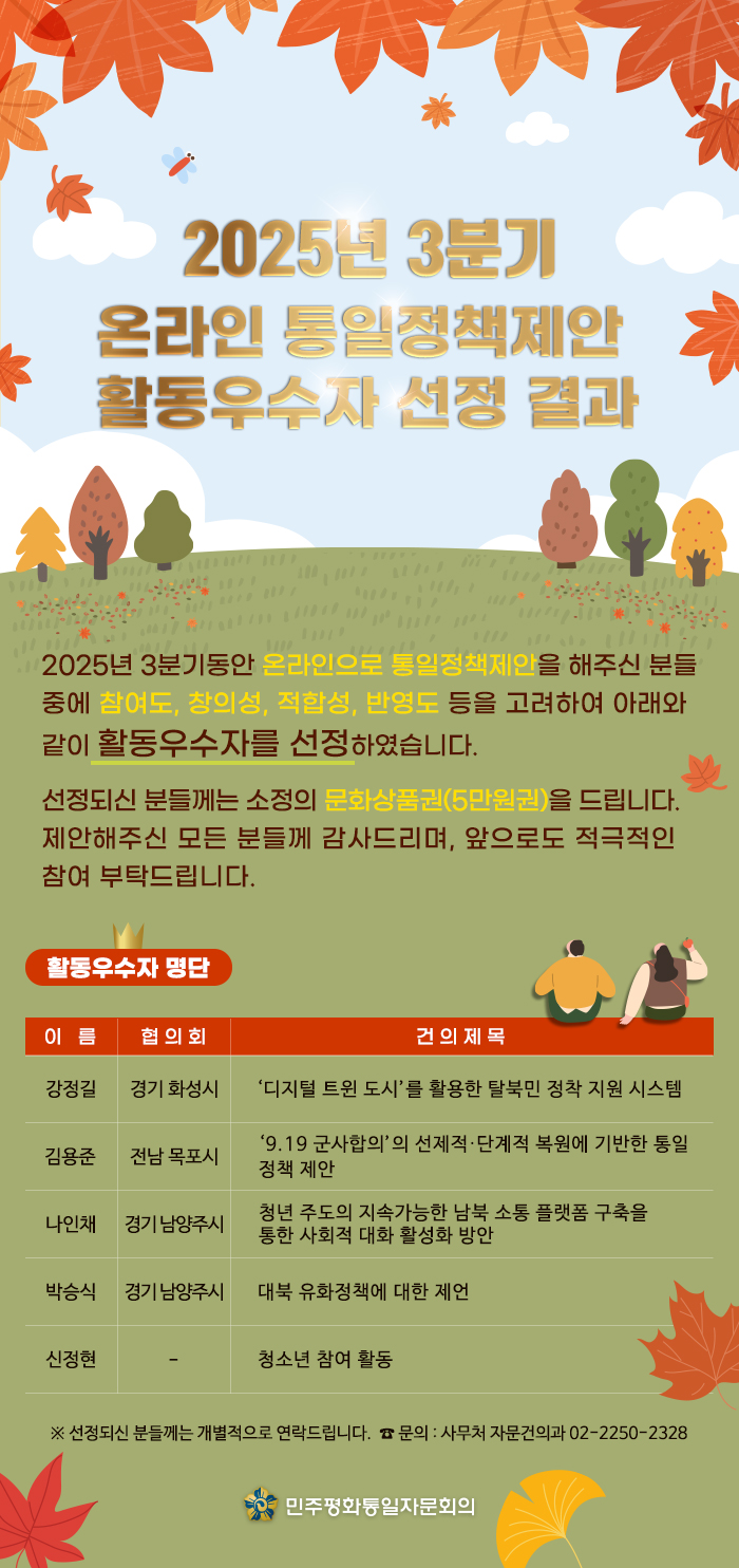 2025년 3분기 온라인 통일정책제안 활동우수자 선정 결과