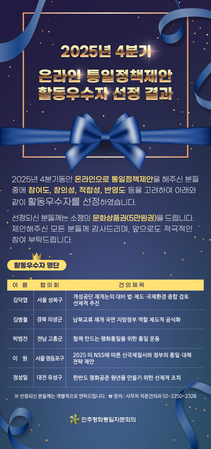2025년 4분기 온라인 통일정책제안 활동우수자 선정 결과